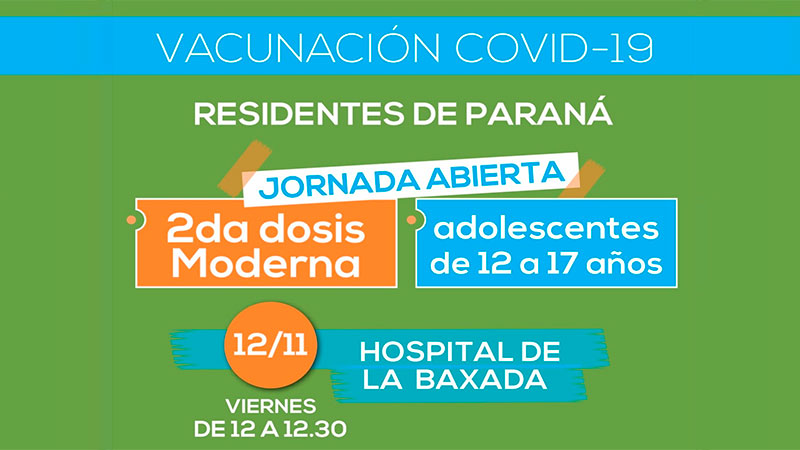 Se realizará este viernes, una jornada abierta de vacunación contra el Covid, para menores de 17 años, de Paraná. Aplicarán segundas dosis de Moderna, sin turno en el Hospital De la Baxada. Los detalles y requisitos.