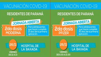 El Plan Rector de Vacunación Covid-19 en Entre Ríos, avanza esta semana, con la inmunización a los distintos grupos etarios. El Ministerio de Salud de la provincia, dio a conocer que este viernes, se llevará a cabo en la capital entrerriana, una jornada abierta de vacunación para adolescentes residentes de Paraná. Será sin turno previo y aplicarán segundas dosis de Pfizer y Moderna.