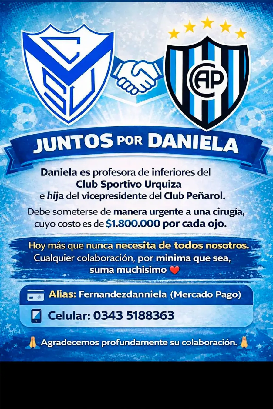 Rifan pasajes y entradas a la Bombonera. En un ejemplo de solidaridad que supera las rivalidades deportivas, Daniela Fernández, profesora de inferiores del Club Sportivo Urquiza e hija del vicepresidente del Club Peñarol, lanzó una campaña para costear su operación en los ojos.