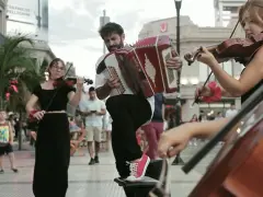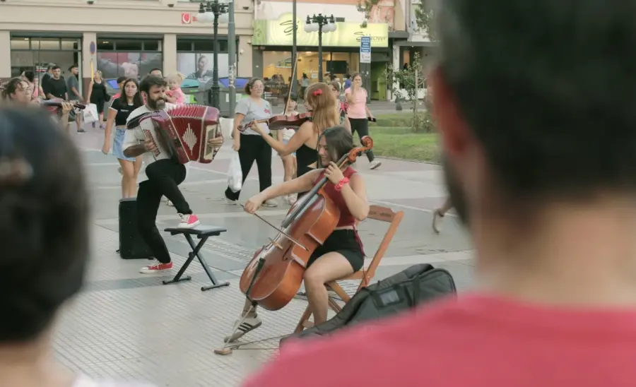 La acción se desarrolló en la peatonal San Martín y la Plaza 1º de Mayo, en pleno centro de la ciudad de Paraná, en un horario de alta circulación. En ese contexto, un ensamble de cuerdas emergieron desde distintos puntos del espacio urbano y confluyeron en la peatonal. Minutos después, se sumó Juan Manuel Bilat con su acordeón para interpretar una reversión de clásicos del chamamé, transformando el pulso cotidiano de la ciudad —en vísperas navideñas— en una experiencia sonora inesperada.