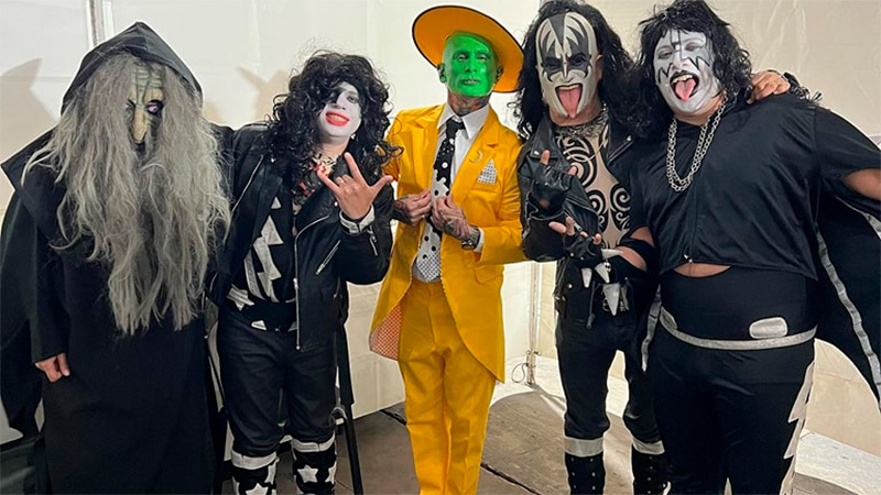 Con un traje amarillo al igual que su sombrero, una camisa blanca, corbata negra y toda su cara pintada de color verde, Emanuel Noir brilló en escenario de la Fiesta de Disfraces junto con todos los integrantes de Ke Personajes que personificaban a la banda Kiss, con sus caras pintas de blanco y negro.