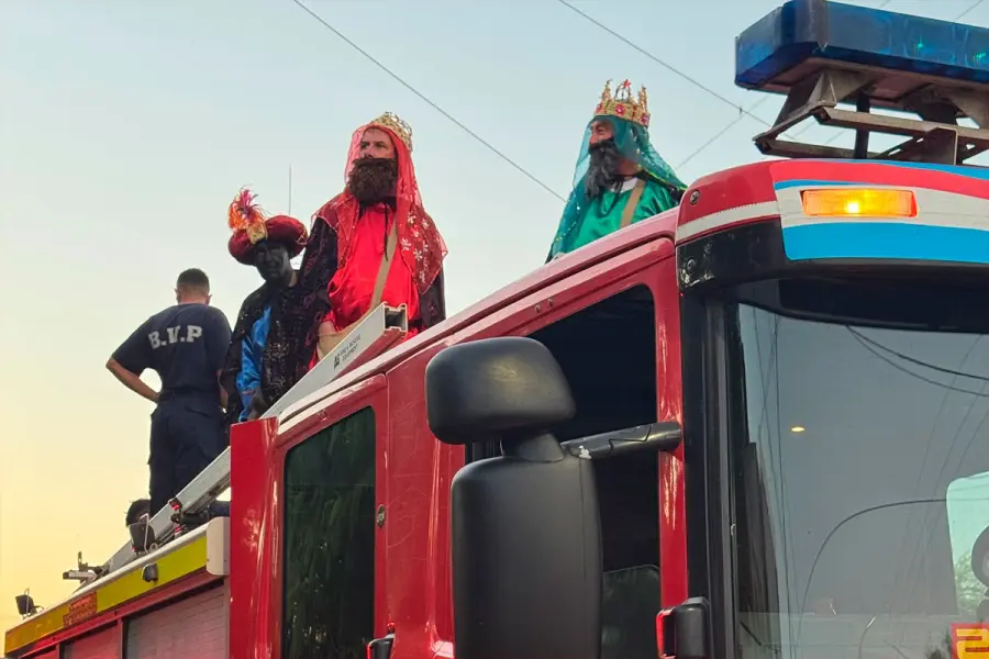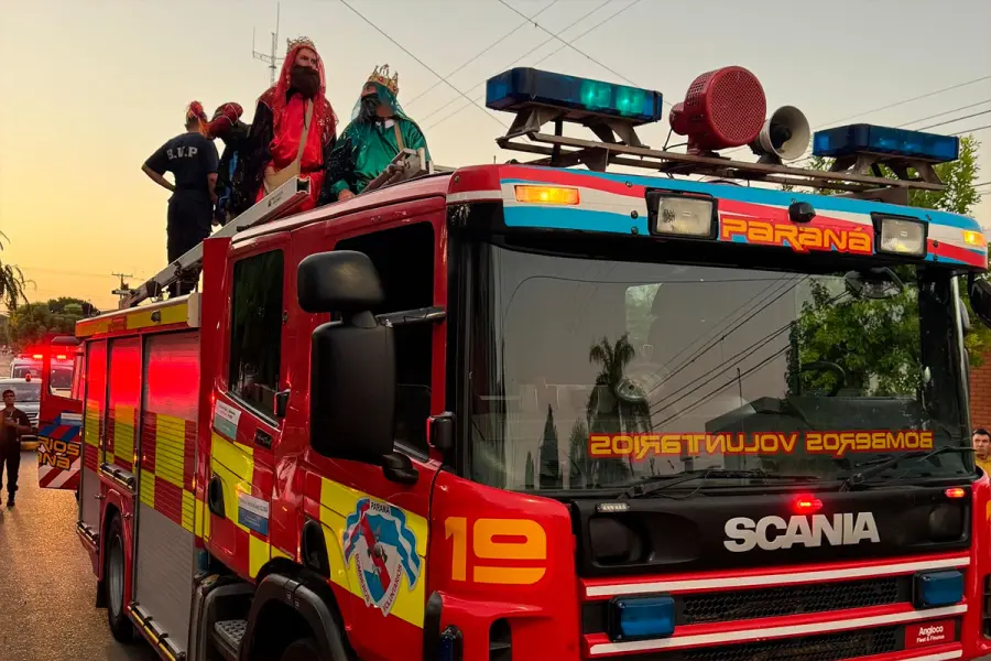 El puntapié inicial fue el recorrido de los Reyes Magos a bordo de la autobomba de los Bomberos Voluntarios de Paraná, que partió a las 20 desde el kilómetro 3 de avenida de las Américas, en la intersección con Juan B. Justo. Cientos de familias acompañaron el paso de Melchor, Gaspar y Baltasar, en una postal cargada de emoción, tradición y alegría para los más chicos.