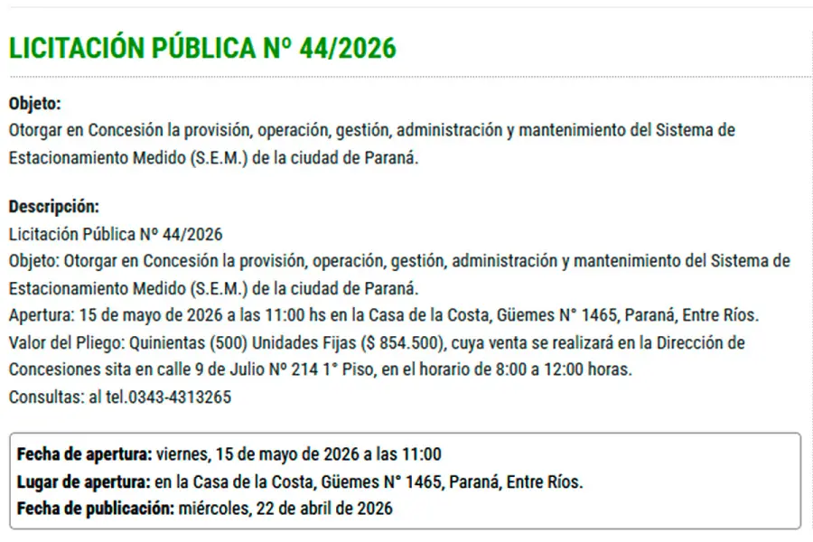 De acuerdo a lo establecido mediante la Licitación Pública Nº 44/2026, la Municipalidad de Paraná avanzó en la convocatoria para adjudicar a una empresa la gestión integral del Sistema de Estacionamiento Medido (SEM). La apertura de ofertas se realizará el 15 de mayo a las 11 en la Casa de la Costa, ubicada en Güemes 1465.
