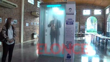 Al destacar que "el sistema de niebla no produce ningún efecto residual, ni ataca ni las mucosas", Guimarey comentó que la cabina cuenta "con un LED automático que da la apertura a la sanitización, en 30 segundos".