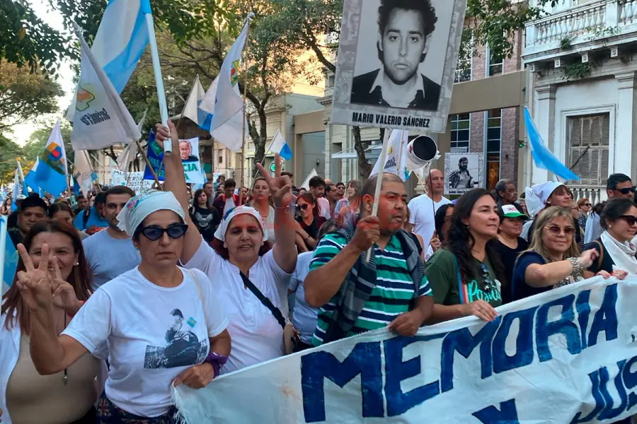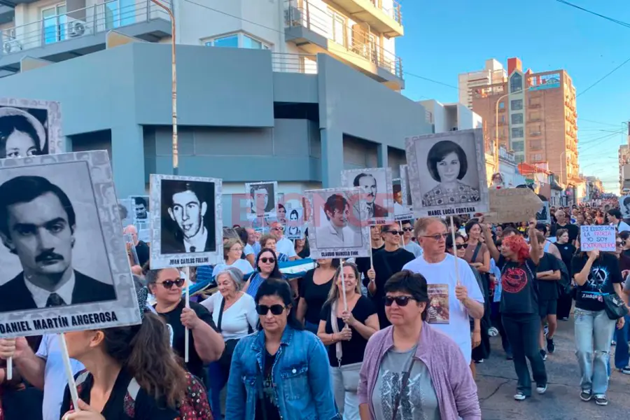 Durante la movilización, los participantes expresaron consignas vinculadas a la memoria colectiva, la defensa de los derechos humanos y el rechazo al negacionismo.