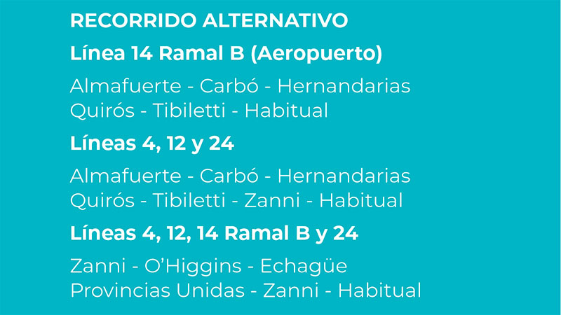 Recorrido: Almafuerte – Carbó – Hernandarias - Quirós – Tibiletti – Zanni – Habitual.