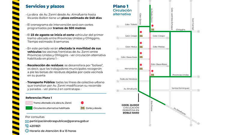 En el tramo de Avda. Zanni comprendido entre Provincias Unidas y O’Higgins, el servicio de recolección de residuos tiene dispuesto un contenedor, ubicado en la zona del Centro de Salud Arturo Oñativia, cercano a la intersección con Gdor. Prócoro Crespo. Debido al inicio de la obra en esa zona, dicho contenedor se moverá hacia calle Prócoro Crespo, metros antes de Zanni en dirección Este, situación que no varía drásticamente la disposición original.