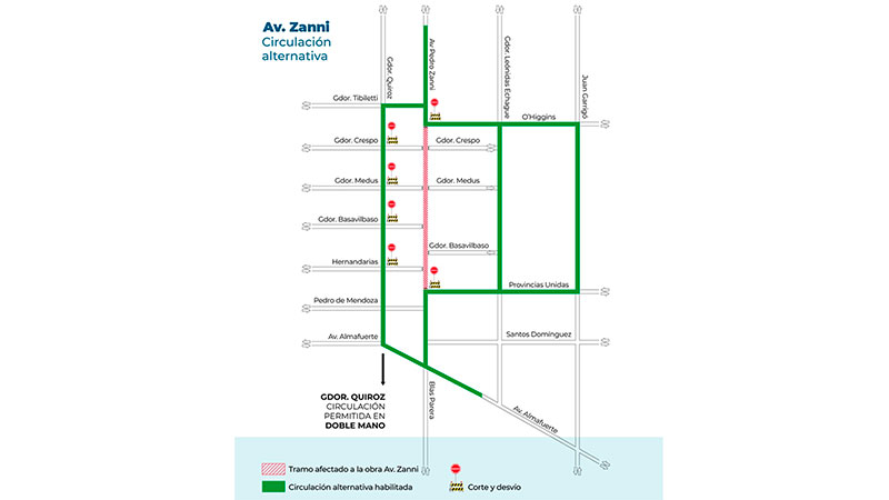 ALTERNATIVA: Desvía por O’Higgins hacia el Oeste hasta Juan Garrigó, por Juan Garrigó hacia el Norte hasta Provincias Unidas, por Provincias Unidas hacia el Este hasta Zanni y retoma por la avenida hacia el Norte.
