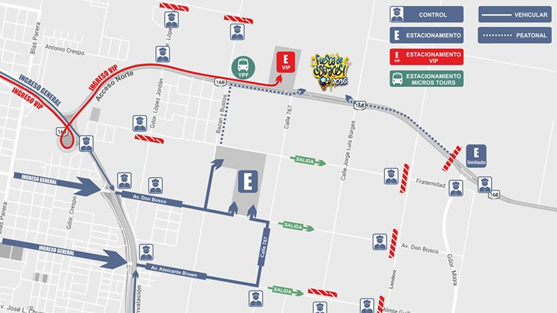 Quienes cuenten con <b>tickets VIP</b>, al igual que en las ediciones de 2010 a 2014, deberán tomar <i>el Acceso Norte, desde Avenida Circunvalación, y estacionar en el espacio oficial y sin cargo contiguo al predio, ubicado en la misma mano</i>. En tanto que los portadores de <b>tickets generales</b> tendrán que circular <i>por las avenidas Don Bosco, Almirante Brown y Circunvalación y doblar (con la ayuda de los puestos policiales) por Bazán y Bustos y Calle 767 para llegar al gran estacionamiento ubicado a 200 metros de la fiesta</i>.