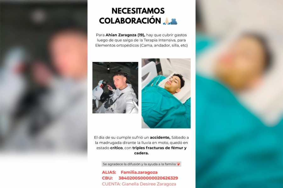 La familia de Ahian Zaragoza, de 19 años, pidió la colaboración solidaria de la comunidad para conseguir dadores de sangre luego de que el joven sufriera un grave accidente en moto el pasado fin de semana. El hecho ocurrió en la madrugada del sábado, cuando intentó esquivar un espejo de agua en la zona de Almafuerte y Circunvalación, en Paraná, y terminó impactando contra un poste de luz.