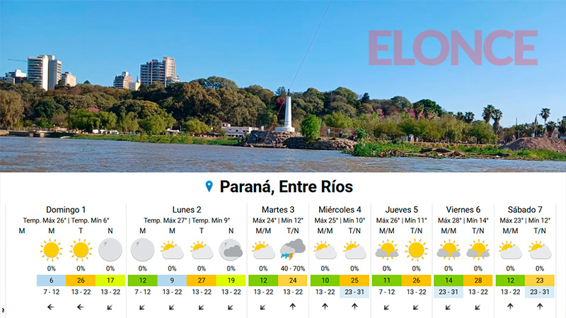 Este domingo se presenta en la ciudad de Paraná y alrededores con cielo despejado, vientos del este por la mañana que rotarán al noreste hacia la noche y una temperatura estimada en 6 grados de mínima y 26 de máxima, informó el Servicio Meteorológico Nacional (SMN).