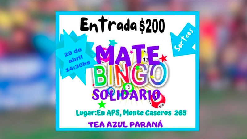 Invita a participar de un mate bingo solidario el 29 de abril a las 14.30. Será en en APS, ubicado en calle Monte Caseros 265. La entrada tiene un valor de $200. Elonce.com