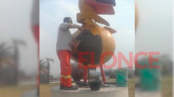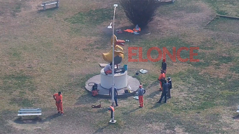Unos ocho empleados municipales se encontraban en la mañana de este miércoles en el parque de la zona del Parque Urquiza realizando las tareas de restauración y posterior pintado de la escultura.