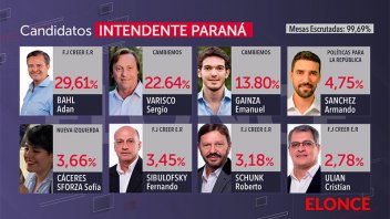 Con el 99,84 % de las mesas escrutadas, el intendente de Paraná, Sergio Varisco, gana la interna de Cambiemos con una ventaja de 23 puntos. En tanto, Adán Bahl obtiene el 67 % en la interna del Frente Creer. Sorpresa en el tercer lugar.