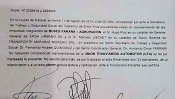 Por otra parte, en la noche del sábado se realizó una reunión en la Secretaría de Trabajo de Entre Ríos, que finalizó sin novedades ya que desde UTA no se hicieron presentes. Estuvieron en el encuentro el titular de Trabajo, Fernando Quinodoz, el representante de Ersa, Hugo Ruiz, y de Mariano Moreno, Marcelo Lischet.