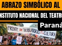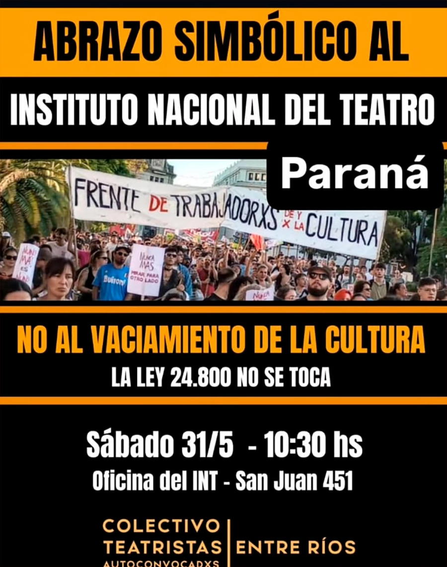 Este sábado a las 10:30, teatristas independientes realizarán un abrazo simbólico al Instituto Nacional del Teatro (INT) en Paraná, como manifestación de rechazo a la decisión del Gobierno nacional de quitarle su autarquía. La jornada se llevará a cabo frente a la sede del organismo, ubicada en calle San Juan 451.