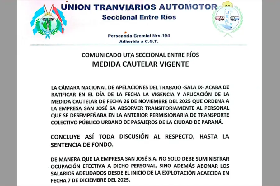 Así lo informó la UTA Entre Ríos en un comunicado, en el que sostuvo que la resolución de la Sala IX “concluye toda discusión al respecto, hasta la sentencia de fondo”. Según indicaron, la empresa debe no solo reincorporar a los trabajadores, sino también garantizarles ocupación efectiva.