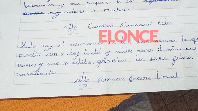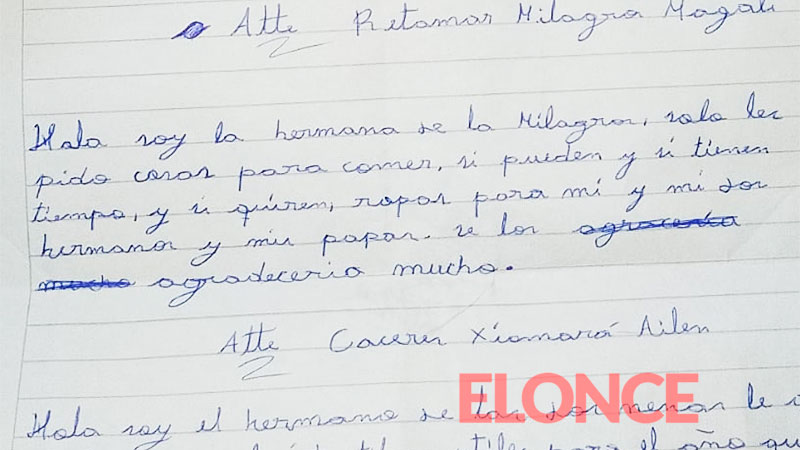 “Solo les pido cosas para comer, y, si pueden, si tienen tiempo y si quieren, ropa para mí, mis dos hermanos y mis papás”, dicen en la carta que mostraron a Elonce. Los emotivos deseos de Navidad y el pedido de ayuda para cumplirlos