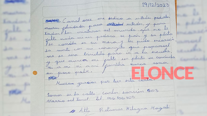 Finalmente, el hermano menor, Ismael Roman Caceres, añadió con inocencia: "Hola, soy el hermano de las dos nenas, les quería pedir un reloj y útiles para el año que viene y una mochila. Gracias, les deseo Feliz Navidad. Atte, Román Caceres Ismael".