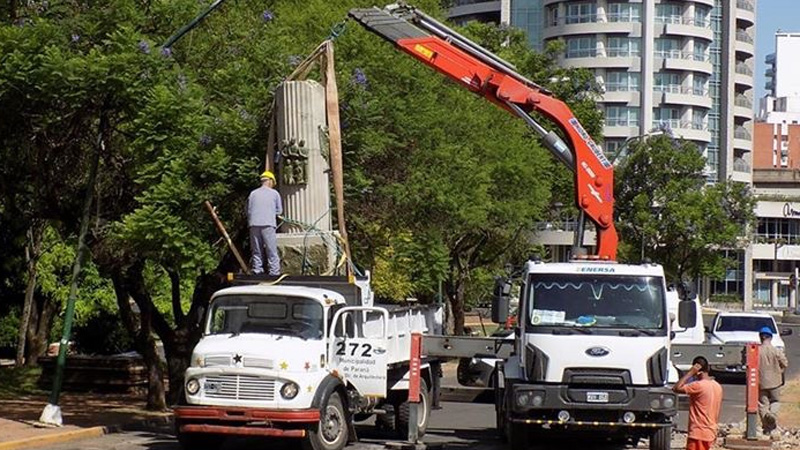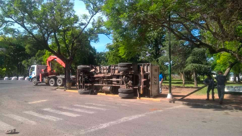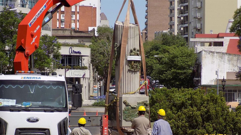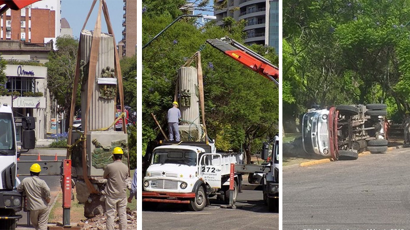 Pero el lugar elegido, desató la polémica y ante el malestar generado en un sector de la sociedad, se decidió reubicarlo. En esa actividad estaba este lunes la cuadrilla de obreros cuando, una vez que lograron depositar la columna de cemento en el camión, el sobrepeso hizo que el vehículo cediera y tumbara sobre su costado derecho. El conductor del vehículo salio ileso.La estructura sufrió algunos daños.