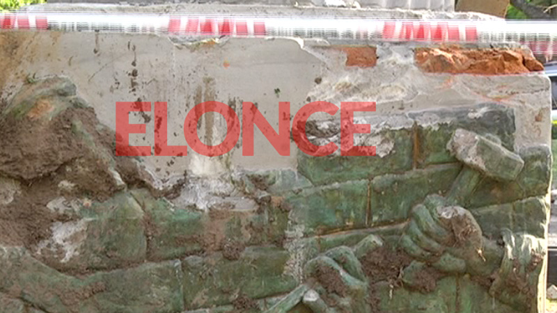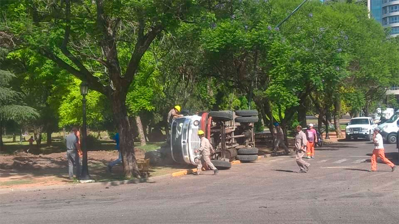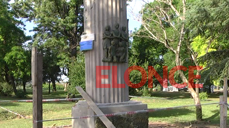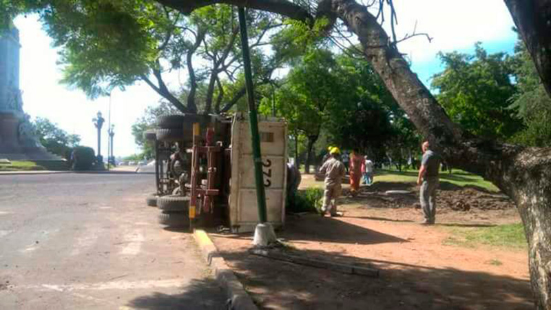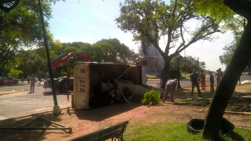 El incidente se registró en la tarde de este lunes. El camión municipal que tenía cargado el monumento masón, ubicado frente a la imagen de Urquiza, para proceder a su traslado, tumbó por el peso de la obra.Sufrió algunos daños.