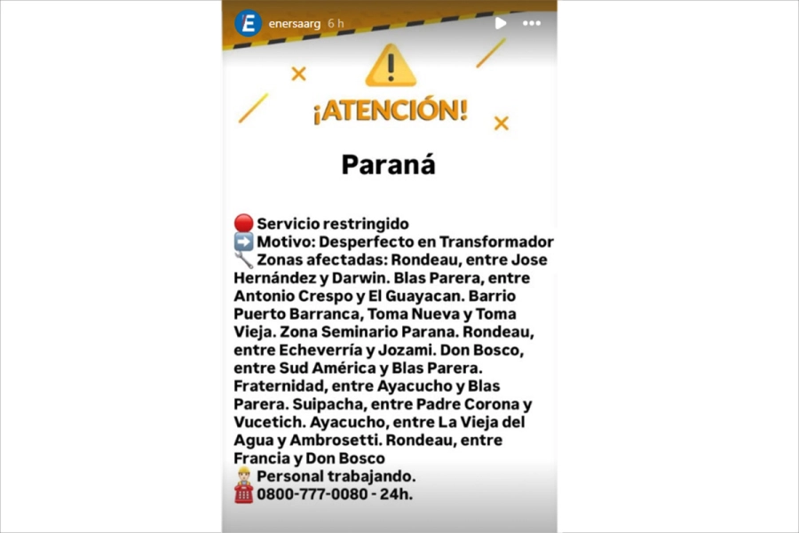 Desde Enersa confirmaron que un desperfecto en un transformador provocó un corte de energía que afectó múltiples barrios de la ciudad de Paraná.