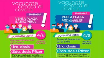 Dos jornadas libres de vacunación, se realizarán este viernes, en Paraná. Será para adolescentes de 12 a 17 años. Se colocarán primeras y segundas dosis. Se desarrollarán de 8 a 12. Todos los detalles.