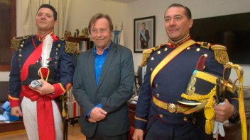 El intendente Sergio Varisco recibió a los Mayores Diego Cejas, director de la Banda de Patricios y Aníbal Ramírez, director de la Fanfarria Alto Perú, a quienes les hizo entrega los decretos que los declara Huéspedes de Honor de la ciudad de Paraná, en el marco de las actividades organizadas por Tecnópolis Federal y por el 204º Aniversario del Ascenso de Paraná al rango de Villa, donde estuvieron presentes.