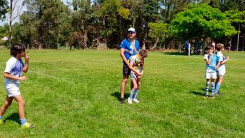 El encuentro tuvo lugar el pasado sábado en las instalaciones del club Tilcara, donde el profesor de la M 9 de Rowing, Federico Tórtul, con un arnés, ayuda a Felipe, con discapacidad a jugar al rugby, supo Elonce.