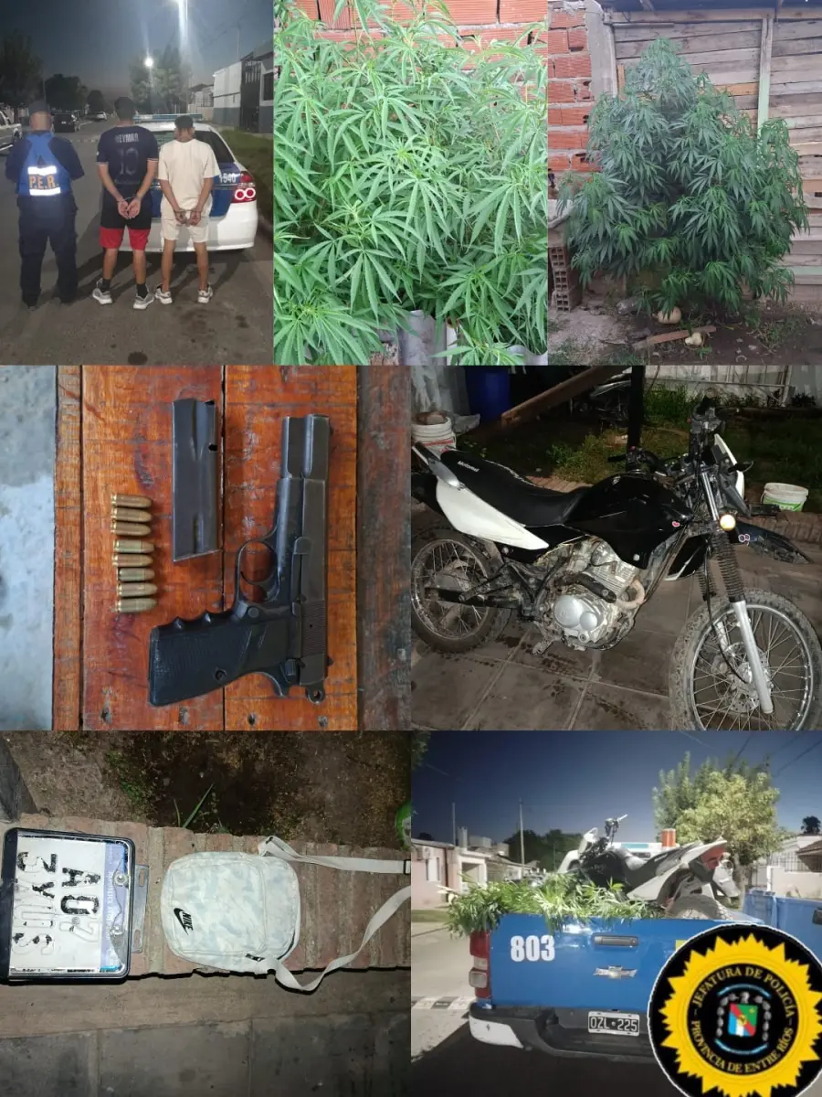 Un allanamiento permitió secuestrar un arma de fuego, una motocicleta, elementos robados y plantas de cannabis. Dos hombres fueron aprehendidos e imputados por tenencia ilegal de arma y estupefacientes.