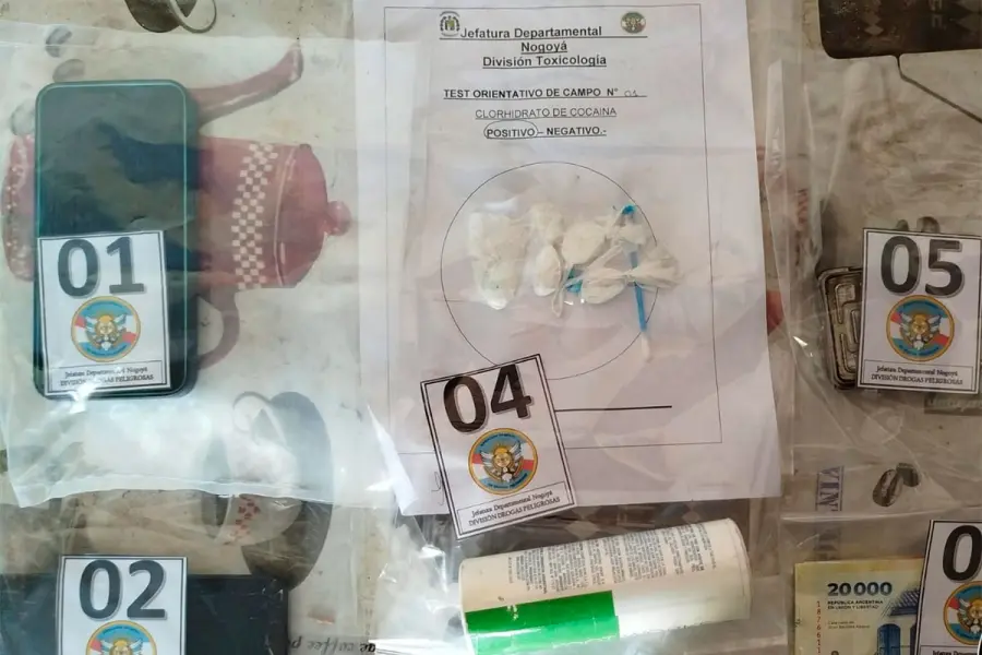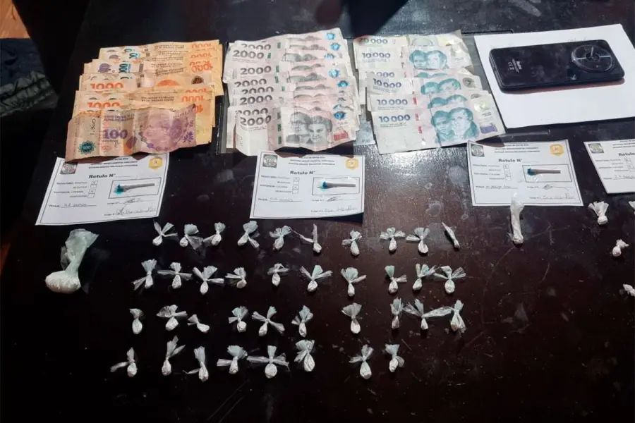 En coordinación con la Fiscalía de Turno, los efectivos se trasladaron hasta el hospedaje donde esta persona se alojaba, ubicado sobre calle San Antonio. Allí constataron la existencia de 20,5 gramos de clorhidrato de cocaína, 2,6 gramos de cannabis sativa y la suma de 189.000 pesos en efectivo.