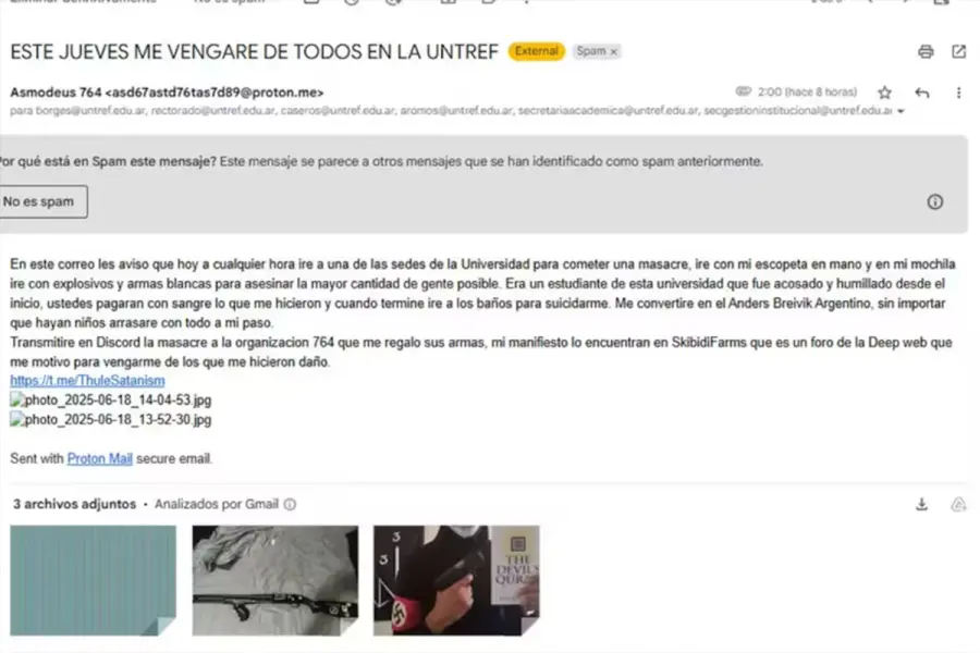 El mensaje llevaba por asunto: “este jueves me vengaré de todos en la Untref”. En el cuerpo del texto, el autor advertía: “A cualquier hora iré a una de las sedes de la universidad para cometer una masacre. Iré con mi escopeta en mano, y en mi mochila llevaré explosivos y armas blancas para asesinar a la mayor cantidad de gente posible”.