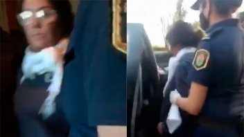 De fondo se oye a personas que alientan a la mujer. "Fuerza, Dolores", "Vamos, Dolores, no estás sola" y "Estamos con vos, Dolo", fueron algunos de los mensajes que le expresaron antes de que la policía la retirara del campo.