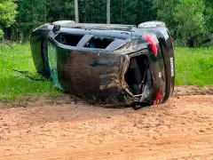 Como consecuencia de esa situación, el Volkswagen Fox perdió estabilidad, giró y terminó volcado, quedando apoyado sobre uno de sus laterales, precisamente del lado del conductor. A pesar de la violencia del vuelco, los ocupantes lograron salir del vehículo.