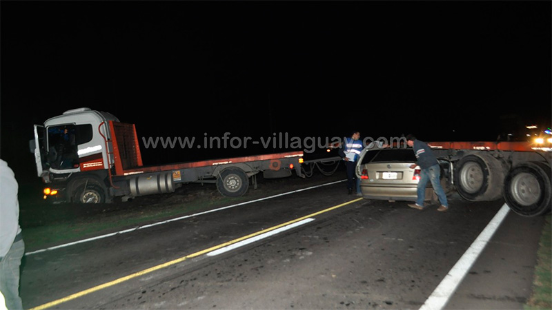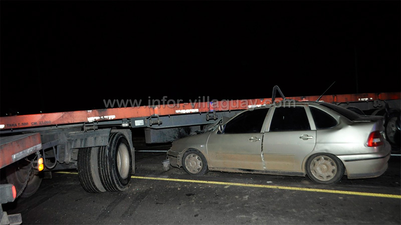 Minutos después, un automóvil Polo en el que iban dos personas, que se dirigía por la mencionada ruta en sentido Oeste-Este se metió debajo del acoplado.