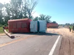 El conductor de un camión Mercedes Benz -que transportaba alimento balanceado a granel para una empresa agrícola- perdió el control del vehículo y volcó sobre el kilómetro 6 de la ruta provincial 20, en el acceso norte a Gualeguaychú.
