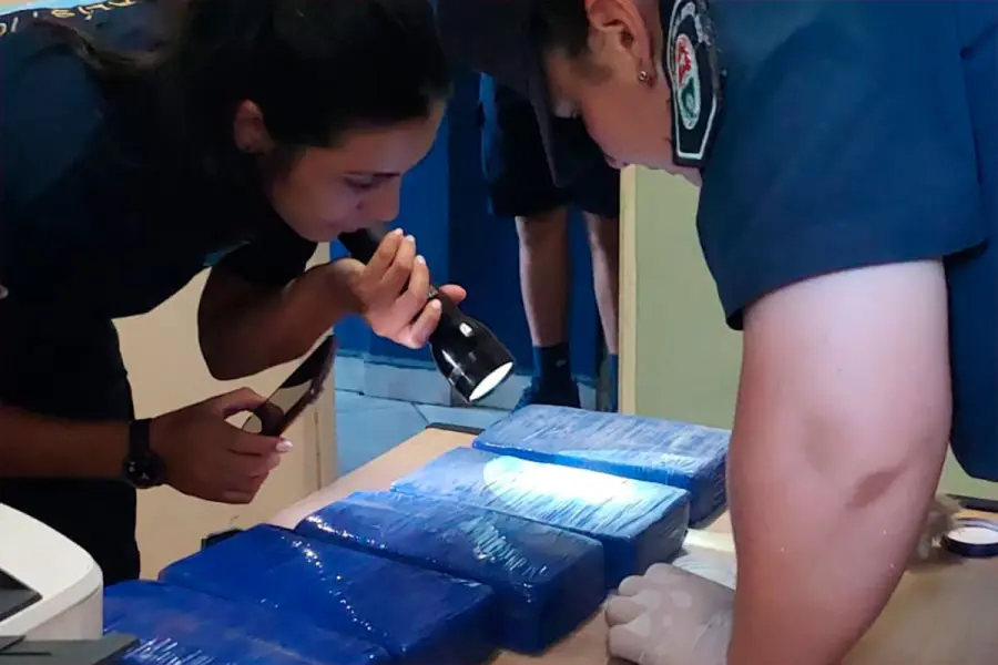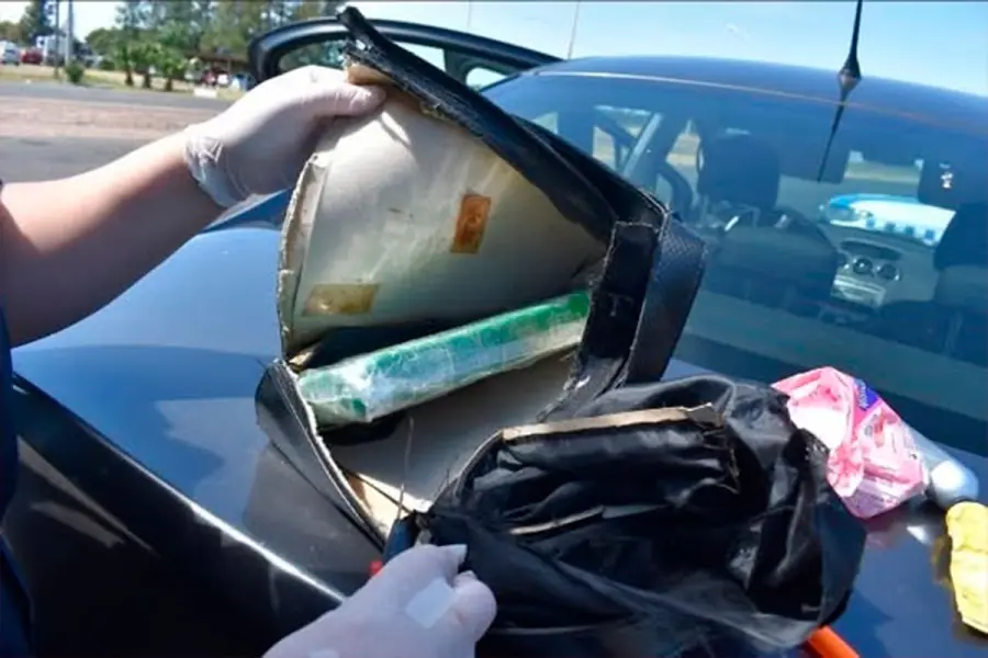 En total, el hombre llevaba adosados al cuerpo cuatro paquetes rectangulares, mientras que en el vehículo se hallaron otros cinco paquetes con características similares. A su vez, en una cartera de cuero negro ubicada en el asiento trasero, perteneciente a la mujer, se encontró otro paquete envuelto en film y cinta verde.