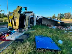 El rodado quedó atravesado en el carril rápido del sentido ascendente, obligando a regular la circulación en una sola mano; en tanto, el acoplado se desprendió producto del vuelco, cayó al cantero central y terminó destruido, esparciendo la carga sobre el suelo.