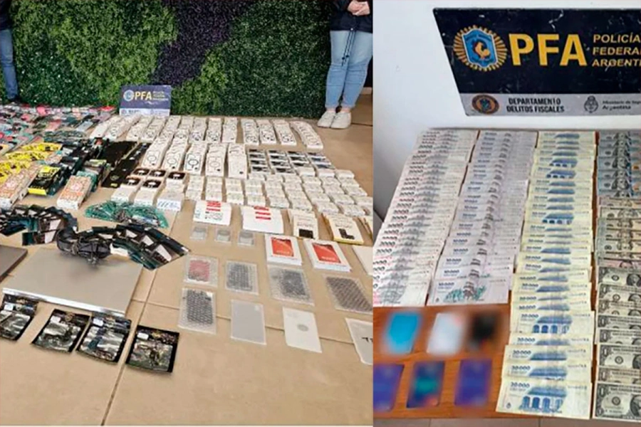 Durante los procedimientos, realizados de forma simultánea junto con personal de la Agencia de Recaudación de Control Aduanero (ARCA), se incautaron 600 celulares, 2.400 fundas, 1.000 accesorios (cargadores, cables USB, auriculares, etc.), casi $8 millones y alrededor de 4 mil dólares.