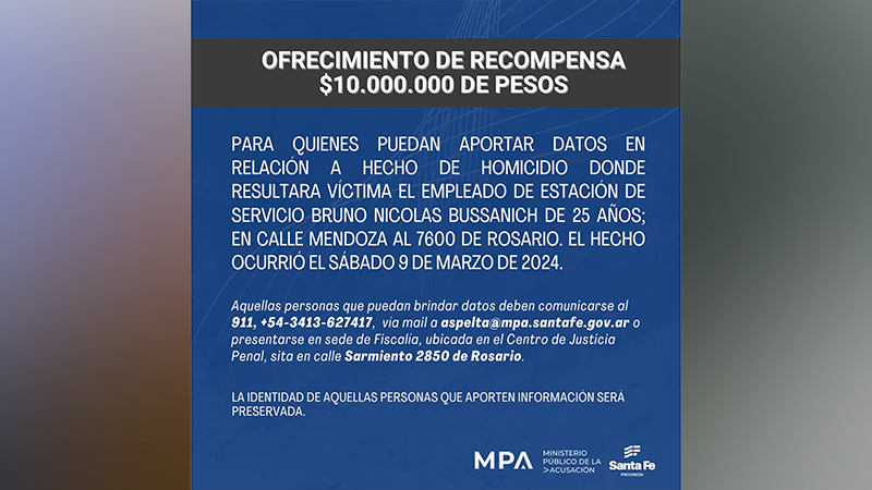 El Ministerio Público de Acusación (MPA) de Rosario ofrece $10 millones de recompensa por información sobre el supuesto sicario que mató al playero Bruno Nicolás Bussanich este sábado por la noche.