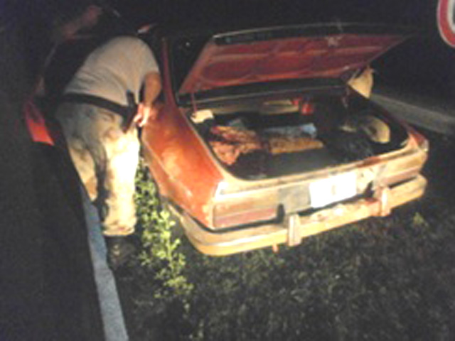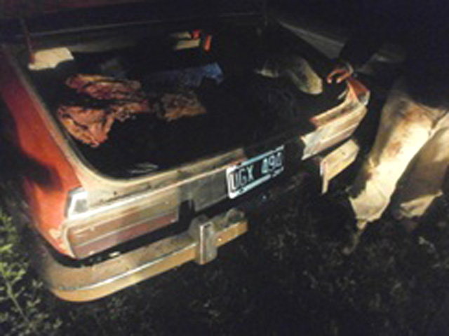 Dos sujetos fueron detenidos en un operativo mientras trasladaban un ternero recientemente faenado en el baúl de un auto; argumentaron que el animal había muerto al ser embestido por un vehículo. Se confirmó que el bovino era robado.