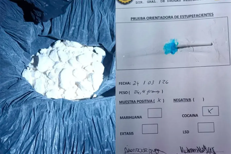 Ante la sospecha, se dio intervención al personal de Drogas Peligrosas, que efectuó un test de campo. El análisis confirmó que se trataba de cocaína, con un peso total de 24,4 gramos.