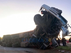 Este camión “quedó mirando hacia arriba, casi parado. Se dificultó un poco la tarea del rescate del camionero, que gracias a Dios sufrió solamente lesiones leves y fue trasladado rápidamente al hospital San José de Cañada de Gómez”.