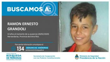 <a href='https://www.argentina.gob.ar/persona-buscada/grandoli' target='_blank'>El Sistema Federal de Búsqueda de Personas Desaparecidas y Extraviadas</a>, dependiente del <b>Ministerio de Seguridad de la Nación, se sumó con el pedido de paradero a nivel nacional del niño Ramón Grandoli, de 13 años de edad</b>, que desapareció en la localidad de Hernandarias, el pasado 28 de febrero pasado.