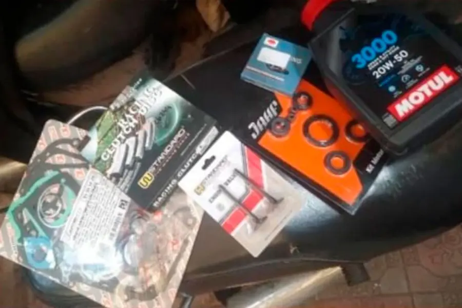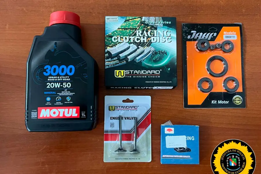 Entre los artículos comprados, detalló que la pareja adquirió una junta de motor completa para 110 cc, válvulas, aros, discos, aceite y retenes, por un monto total de 56.000 pesos.