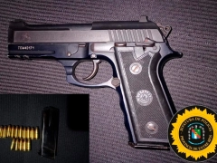 Posteriormente, en un recorrido por la zona, se encontró un arma de fuego tipo pistola, calibre 9x19 mm, marca Taurus, en cercanías de los baños del establecimiento. El arma contenía un cartucho en la recámara y otros 14 en el cargador.