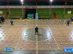 El operativo continuó en el Polideportivo Municipal de Puerto Esperanza, donde se realizó el test, recuento y pesaje de los paquetes. Se contabilizaron 309 "ladrillos" de cannabis sativa y 41 paquetes de cogollos, con un peso total de 1.046 kilogramos.