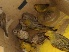 Jilgueros dentro de una caja de cartón. Efectivos de la Sección de Seguridad Vial "Mercedes" del Escuadrón de Seguridad Vial Autopistas Noroeste, dependiente de la Agrupación Buenos Aires de Gendarmería Nacional, detuvieron la marcha de un vehículo en un operativo de control sobre la Ruta Nacional N° 5, a la altura del kilómetro 86, en el Peaje Olivera, partido bonaerense de Mercedes.