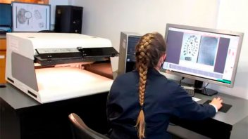 El video espectro comparador también se emplea, por ejemplo, para analizar documentos cuestionados. “Es un equipo que tiene diversas longitudes de onda de luz. Uno coloca un elemento y el equipo revela impresiones, se ve lo que a simple vista lo que no se puede ver. En el caso de la plantilla analiza el desgaste, el uso. Van quedando marcas en la plantilla. Lo que hacemos es resaltar lo que ya existe”. “