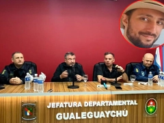 La exposición estuvo a cargo del ministro de Seguridad y Justicia, Néstor Roncaglia, el jefe de la Policía de Entre Ríos, Claudio González, y el jefe departamental de Gualeguaychú, Luis Alberto Báez. Durante la conferencia, explicaron que el hombre fue aprehendido en la entrada de un hotel de la ciudad mientras intentaba organizar su cruce ilegal hacia Uruguay junto al menor.